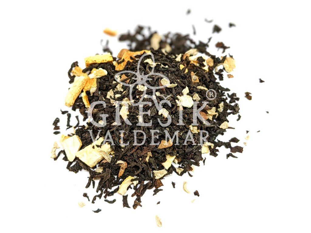 Složení: pravý černý čaj, pomerančová kůra 11 %, přírodní aroma, citrónová kůra, skořice kůra 2,4 %, hřebíček 1,8 %