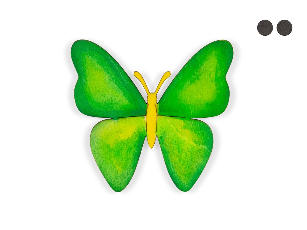 Motýlek o velikosti 70x74mm se skvěle hodí jako dekorace při jarní a letní výzdobě. Motýlek je vyroben z topolové překližky o tloušťce 3mm. Motýlka lze použít jako magnetku. Motýlka lze pomalovat nejlépe akrylovými barvami, temperami a vodovkami. V balení se nachází ke každému motýlku 2ks samolepících neodýmových magnetů. Jedná se o český výrobek.