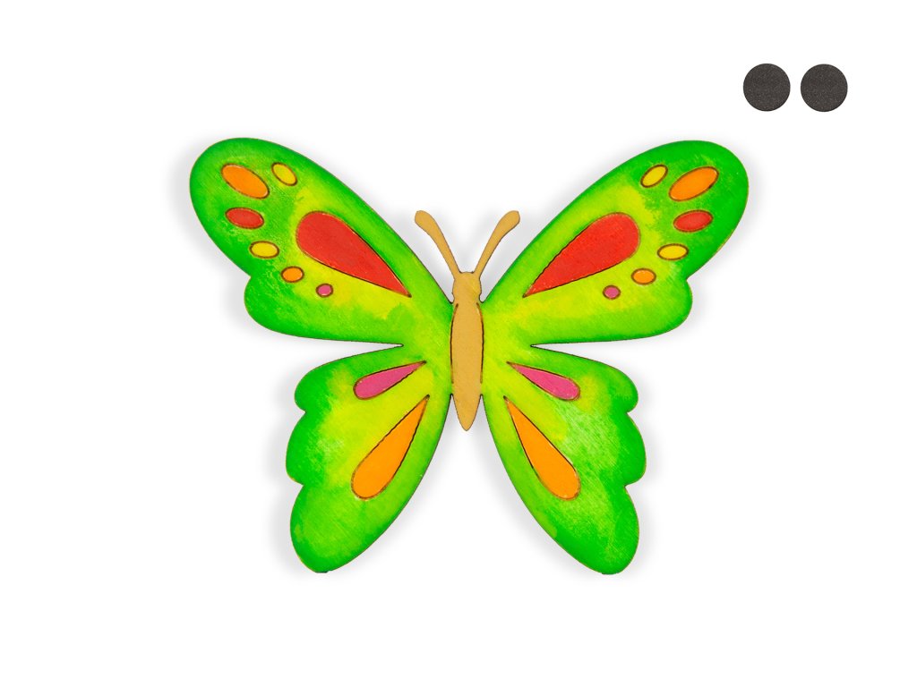 Motýlek o velikosti 70x89mm se skvěle hodí jako dekorace při jarní a letní výzdobě. Motýlek je vyroben z topolové překližky o tloušťce 3mm. Motýlka lze použít jako magnetku. Motýlka lze pomalovat nejlépe akrylovými barvami, temperami a vodovkami. V balení se nachází ke každému motýlku 2ks samolepících neodýmových magnetů. Jedná se o český výrobek.