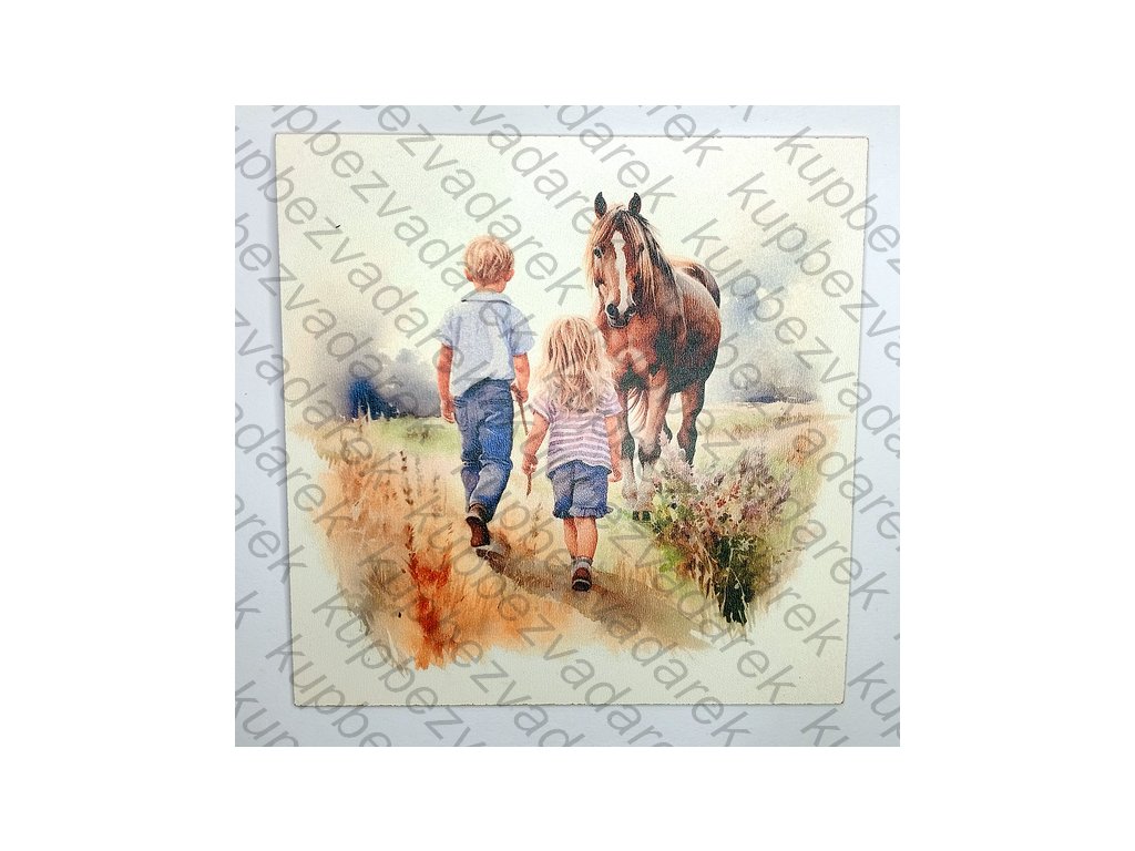 Obrázek na destičce - Děti s koněm č.1 - 20 x 20 cm