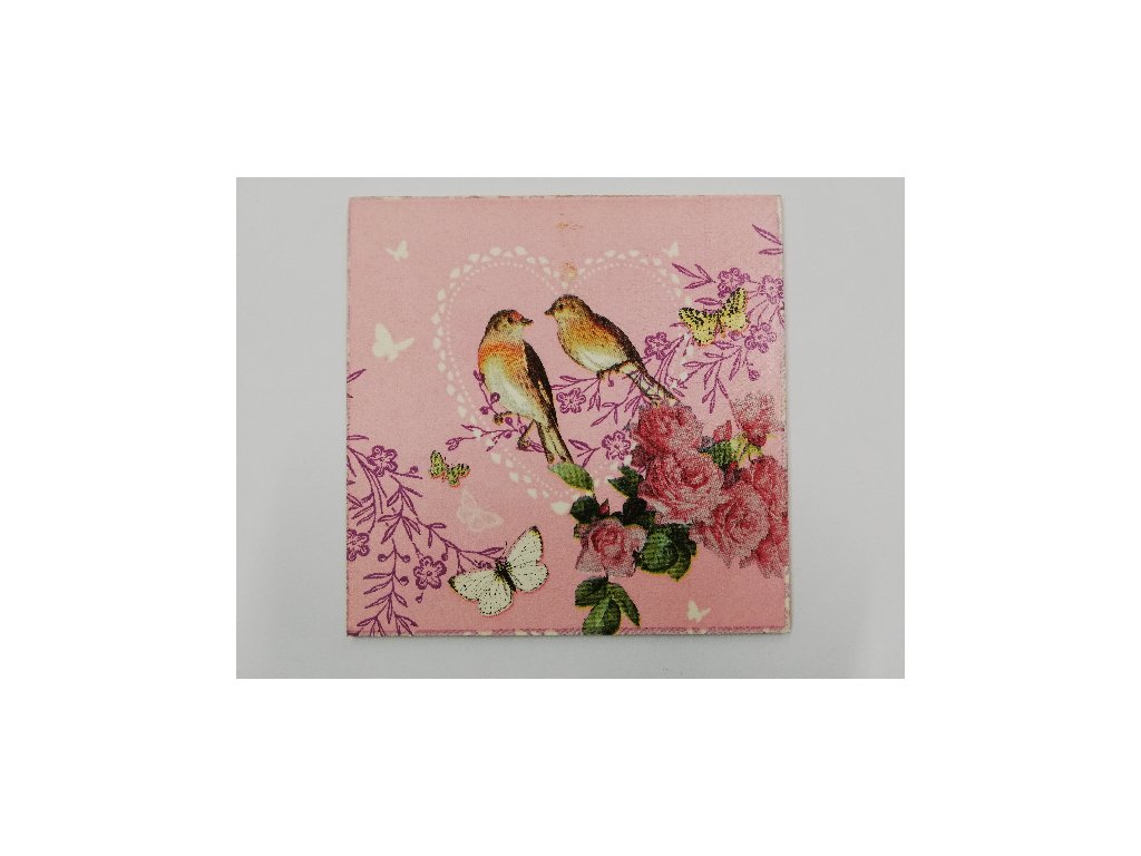Obrázek na destičce - Ptáčci s růžemi na růžové - 15 x 15 cm