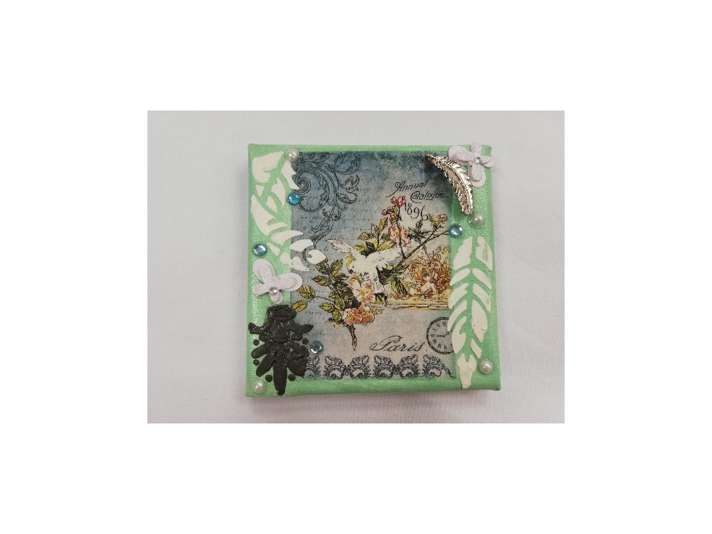 Natřený světle zelenou barvou a nalepené různé aplikace. Vše je na plátně.