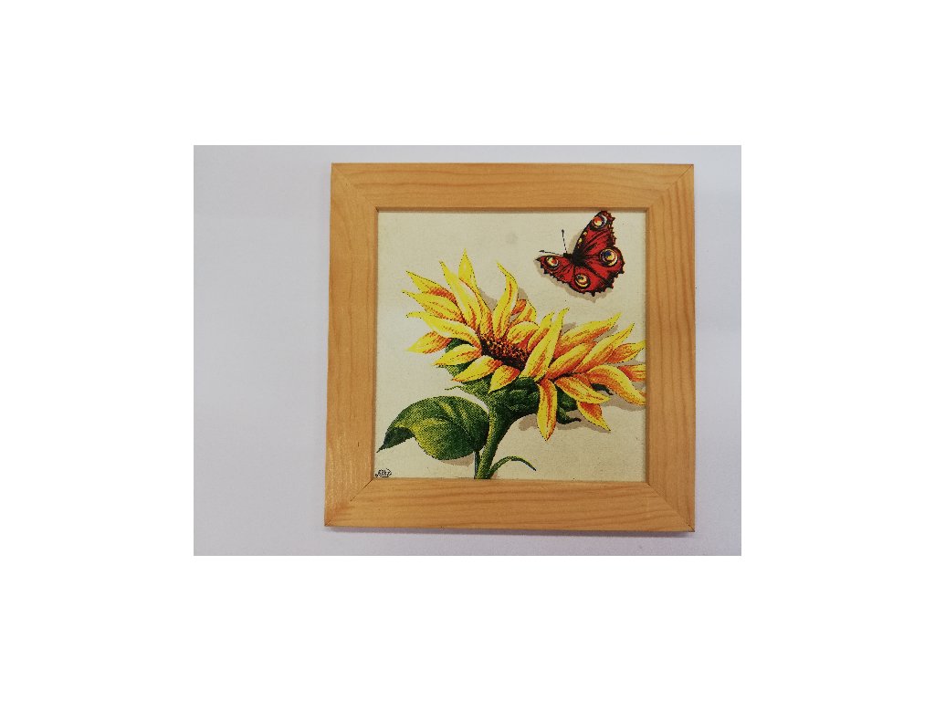 Obrázek v rámečku přírodní - Slunečnice a motýl - 16 x 16 cm