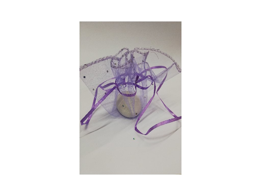 Kolo je šité z organzy a celkový průměr je cca 26 mm, prošívaný střed na stáhnutí má průměr cca 15 mm. Okraje jsou zdobně prošívané stříbrnou nití a tvoří pravidelné řasení o šířce cca 5 cm.