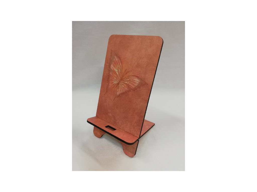 Dřevěný stojánek na mobil s pěkným motivem na přední straně. Stojánek se dá rozložit a lehce složit takže ho můžete vzít kamkoliv sebou.
