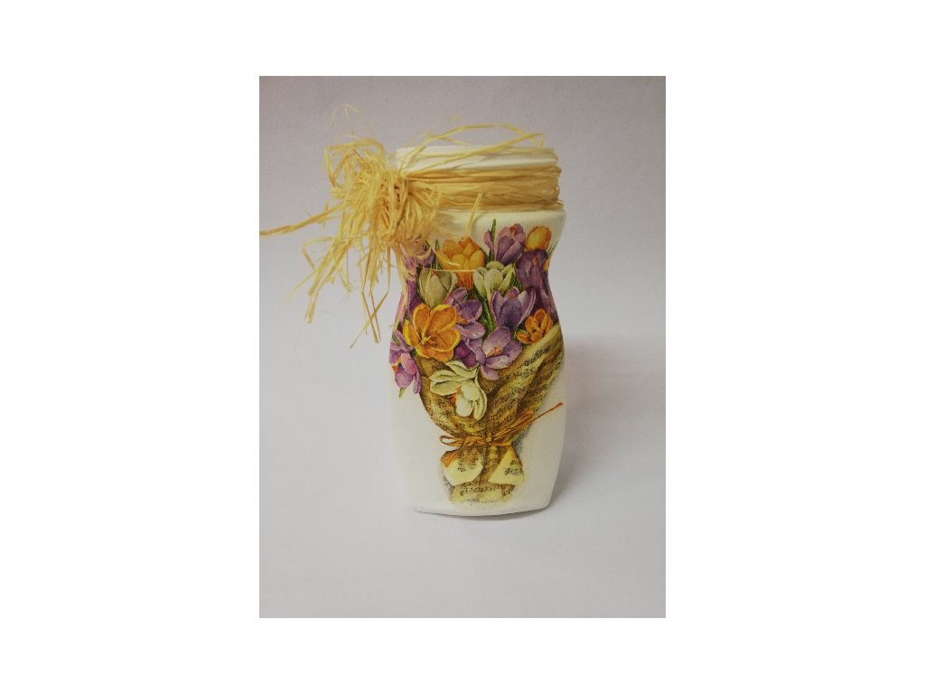 Skleněná váza je z recyklonavého skla, natřená tupovací metodou a zdobená ubrouskovou technikou.