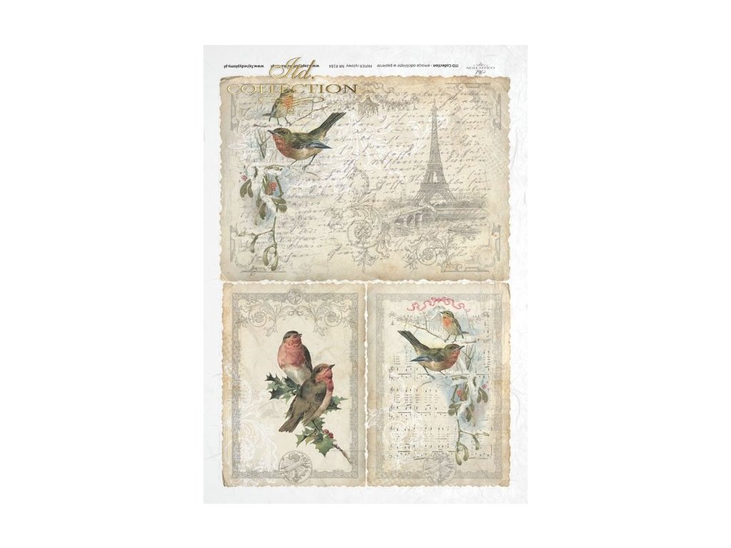 Rýžový papír A4 pro tvoření ITD - Paris, písmo, ptáci, noty, béžové - R0184