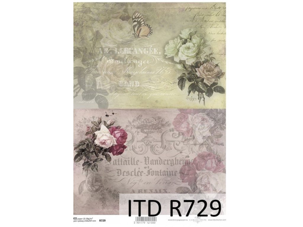 Rýžový papír na decoupage ITD - Písmo,růže,květy,2 motivy - R0729
