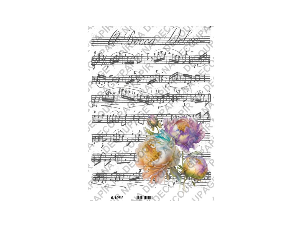 Rýžový a soft papír na decoupage - Pivoňky na notovém papíře - KB01061