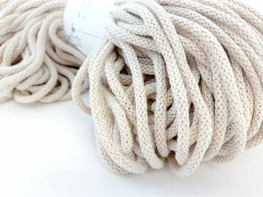 Šňůra je namotaná v přadenu staženém uprostřed (nesundávejte etiketu, pouze tahejte za viditelný konec). Rozhodli jsme se pro toto balení, protože šňůry se takhle nedeformují a jsou vhodné i pro macramé dekorace, kde je každý nedostatek vidět. A zaberou méně místa.