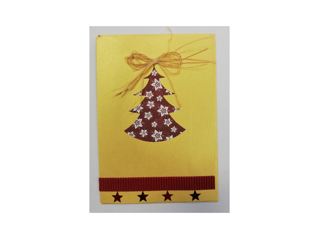 Dvojité vánoční přání s mašličkou - hnědý stromeček ve zlatém