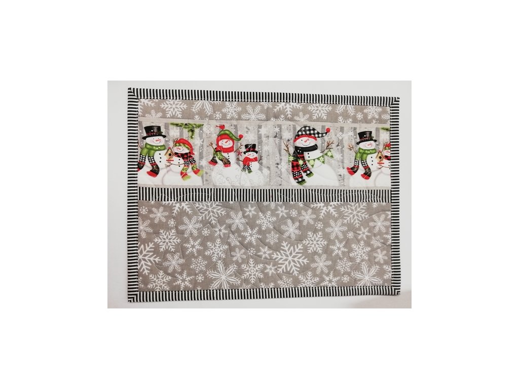 Na podkladu s natištěným vánočním motivem. Zadní strana je bílá, okraje jsou obšité tmavě šedě. Prostírání je ruční výroba, celé prostírání je prošívané.