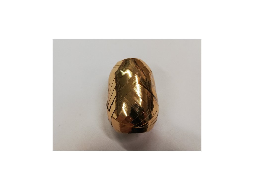 Kvalitní vázací stuha v zlaté barvě s kovově lesklým povrchem. Stuha se dá podélně trhat a přetažením přes okraj ostrého předmětu se zkroutí, vyrobena z velmi kvalitního pevného materiálu. Rozměry: šířka 0,5 cm, délka 20 m, navinuta do samonosného tvaru vajíčka (Ø cca 4,2 cm, výška 6,2 cm), klubíčko je zataveno do smrštitelné fólie, vyrobeno v ČR.